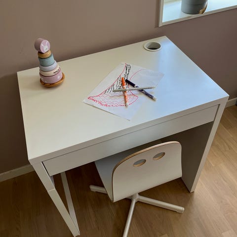 Skrivbord med stol för barn. Rosa. Sparsamt använt så väldigt fint skick. Utdragbar låda för att ha pennor och ritblock i. Passar barn 3-5 år. Mått Bredd 80, djup 48 höjd 60cm. Sitthöjd stol 30 cm.