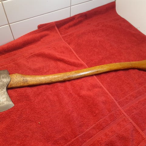 En skarp och fin huggyxa. Den behöver inte slipas. Det är bara att börja hugga direkt.