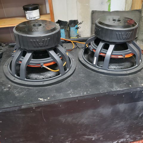 2 st Dubbel bas låda högtalarkabinett. Ytter material i svart beklädnad med röd port sektion. Invändigt är lådan uppbyggd med 22 mm MDF och rejält med stagning och dämpmaterial. Endast 2st Beyma 15G450/N element är okej. Dom 2 trasiga följer med.