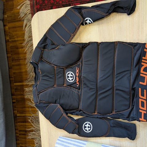 Unihoc Shield målvaktsbyxor i svart färg. Byxorna har kraftig vaddering och förstärkta partier över lår, höfter och knän för skydd vid innebandyspel. Modellen har sydda skyddspaneler och Unihoc-loggor på benen. Passar som skyddsutrustning för innebandymålvakt vid träning och match.