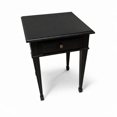 Woodnotes twiggy Sido- eller soffbord i svart trä med glasskiva. Bordet har en kvadratisk form med rundade hörn och kryssformade stag mellan benen för stabilitet. Passar som avlastningsbord bredvid soffa eller fåtölj, eller som mindre bord i vardagsrum eller sovrum.