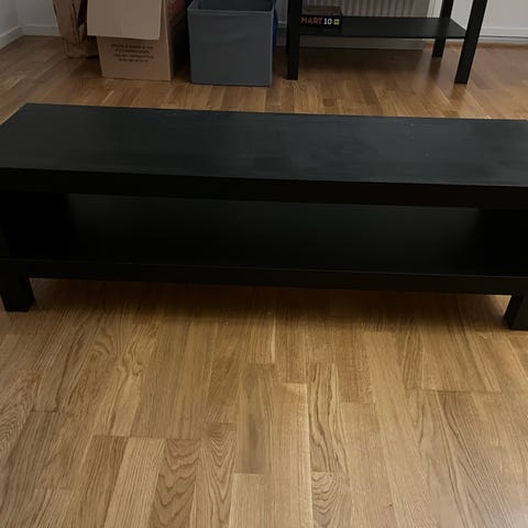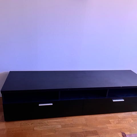 Tv/mediamöbel i svartmålad träfaner. En låda och ett hyllplan med nerfällbar front. På denna sida är det öppen baksida för sladdar osv.