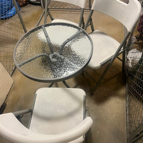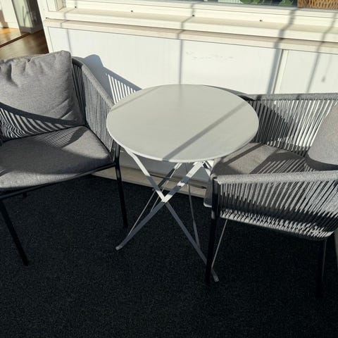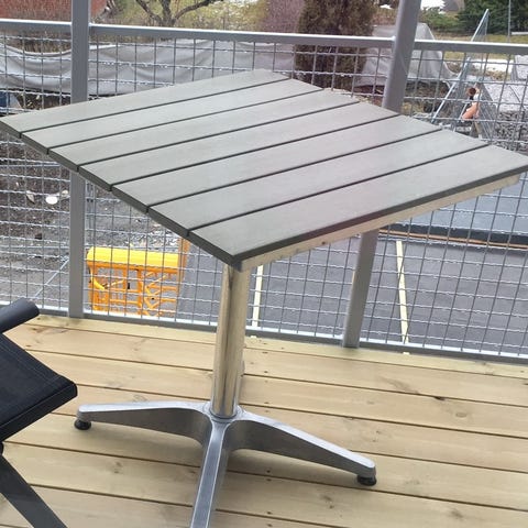 Ihopfällbart balkongbord med Perstorpbeklädnad i fint skick, ljusgrått svagt randigt. Från 50-talet