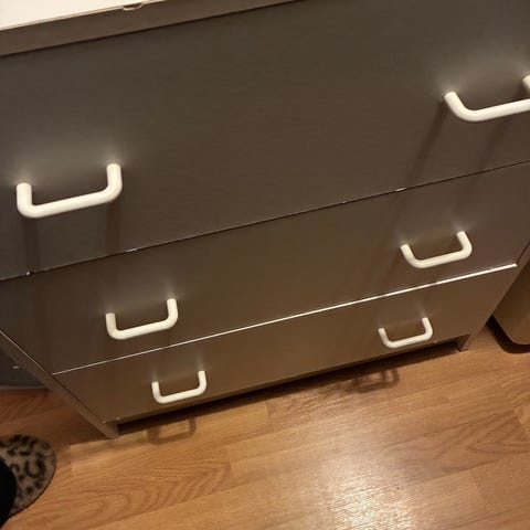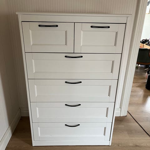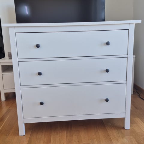 Kompakt vit byrå: En enkel och stilren byrå i vitt. Den har tre lådor och passar perfekt för förvaring i sovrummet, hallen eller var som helst där du behöver extra utrymme. Dess minimalistiska design gör den lätt att matcha med olika inredningsstilar.