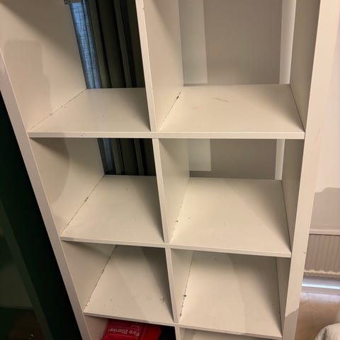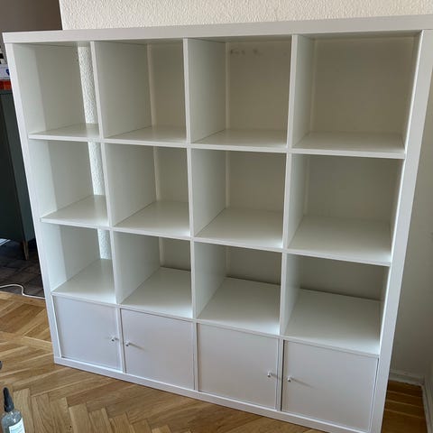 Kallax hylla med två lådor och en lucka.