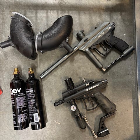 Paintballmarkör av märket Spyder, modell AMG. Markören är utrustad med en extern lufttank och manometer. Saknas laddare och legat ett bra tag men fullt fungerande när den används men vet inte nu eftersom laddaren har försvunnit.