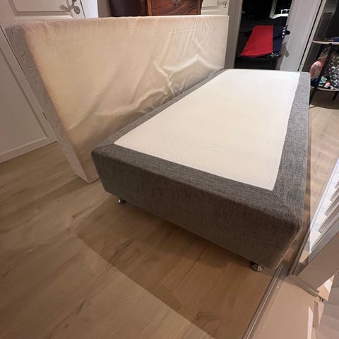 IKEA Hövåg säng med resårmadrass i grått utförande. Sängen har en stoppad sängram med huvudgavel och en Hovåg resårmadrass. Säljs pga köp av större säng.