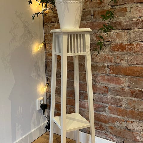 IKEA sidobord/ piedestal, sängbord i vitt trä. Bordet har fyrkantig bordsskiva och svarvade ben. Passar som avlastningsbord eller piedestal i hall, vardagsrum eller sovrum för till exempel växter, ljus, lampa.