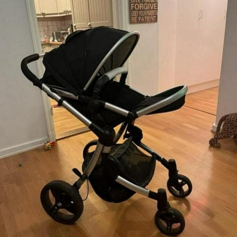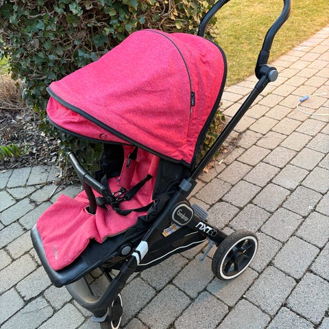 Kinderkraft sulkyvagn i rosa med svart chassi. Vagnen har tre hjul, justerbart handtag och en större sufflett med tittfönster. Utrustad med sele och bygel för barnet samt fotstöd framtill. Passar för promenader och vardagsbruk där en lättare och mer kompakt vagn önskas.