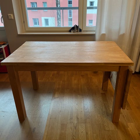 Matbord i massiv ek som går att slipa och olja för att få ett fräscht nytt utseende. Tilläggsskivan går att fälla ut för att få ett bord som är 160cm. Infällt är det 120. Perfekt för små kök