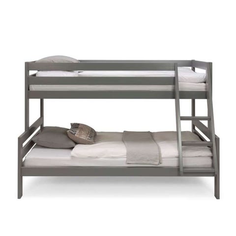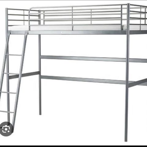 Våningssäng i metall med 2 liggplatser på varandra. Stabil stege på sidan. Konstruktionen är i grålackerad metall med ribbotten i metall på båda planen. Passar för bäddmadrasser i enkelbäddsformat (ej inkluderade).