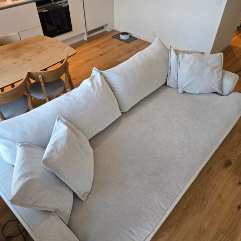 Soffan har fast klädsel på stommen, men soffans kuddar och dynor är avtagbara och går att tvätta.