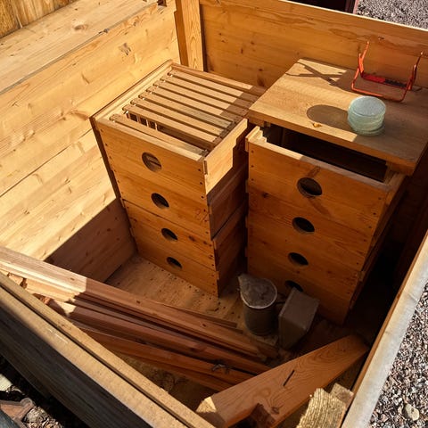 Är två år gammal. Målad i faluröd med flera lager. Materialet är OSB skivor, samt vanlig 4.5*4.5 reglar. På locket ligger tjärpapp. Ingen botten så nederbörd rinner igenom så att den inte står i vatten. Är tung så den rör sig inte.