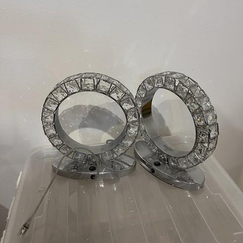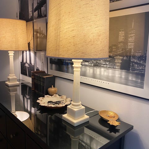 Två höga bord lampor med skärm