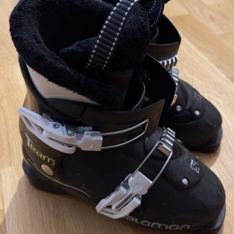 Salomon Team alpina pjäxor för barn. Storlek 21/21,5 med yttermått 259 mm enligt märkning på sulan. Modellen har två justerbara spännen i plast/metall och svart skal med ljusa detaljer. Invändigt finns vadderad och mjuk innersko för ökad komfort. Passar för alpin skidåkning med standard alpina bindningar.