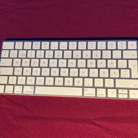 Apple Wireless Keyboard tangentbord i vit färg. Kompakt trådlöst tangentbord med låg profil och chiclet-tangenter. Passar för användning med datorer och andra kompatibla enheter som stöder Apple Wireless Keyboard via Bluetooth. Drivs med batterier och har integrerat aluminiumhölje med vit ovansida.