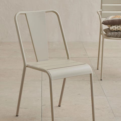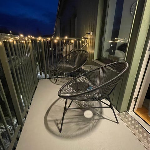Två loungestolar/balkongstolar. Stolarna har rund, skålformad sits med spänd tråd i beige färg och ben i metall. Passar för användning på balkong, altan eller uteplats.