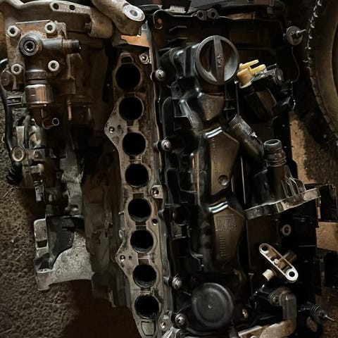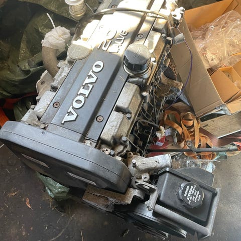 Volvo motordelar. Bilden visar en demonterad motor med bland annat topplock, kamaxlar och tillhörande komponenter. Finns även