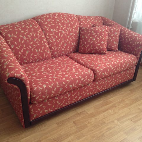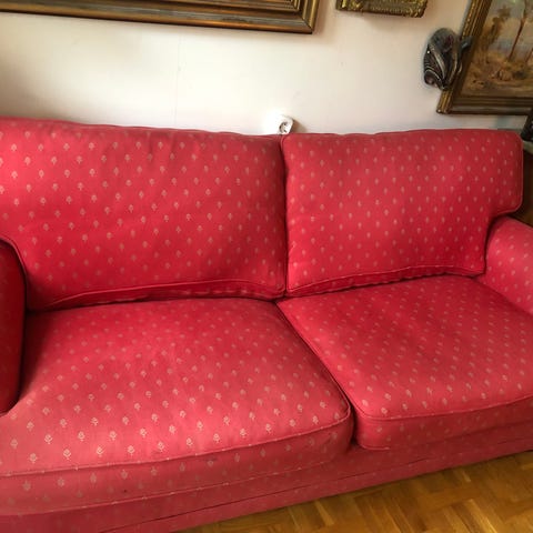 Soffa, bredd2,15 med armstöd, djup55cm höjd 75 cm rutmönstrad gul ljus vinröd. Fåtöljen bredd 1meter från arm stöd till armstöd djup 55 cm höjd75 cm. Hämtas