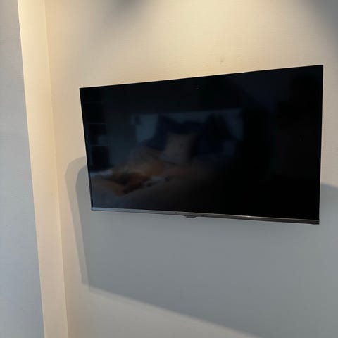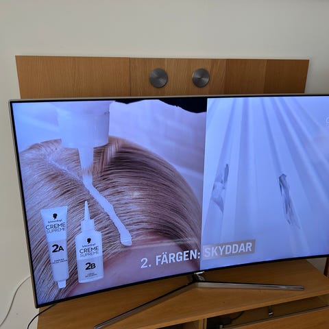 Samsung böjd tv i svart utförande. Tv:n är väggmonterad på bilderna och har en välvd skärm som ger en omslutande bild. Passar för vardagsrum eller andra rum där man vill ha en fast vägginstallation. Exakta tumstorlek och modellbeteckning framgår inte av underlaget och bör kontrolleras vid behov.