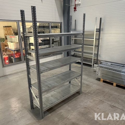 Industriella hyllställ i galvaniserat utförande, anpassade för kylrum/livsmedelsmiljö.