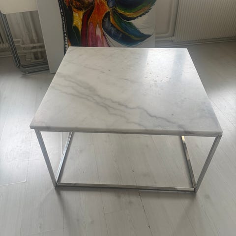 Säljer ett soffbord med vit marmorskiva och svart metallunderrede. Bordet är i bra skick med några enstaka repor som inte påverkar helhetsintrycket.