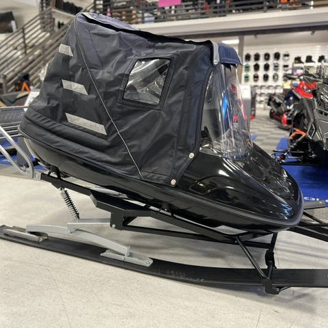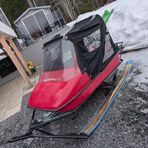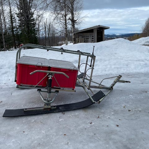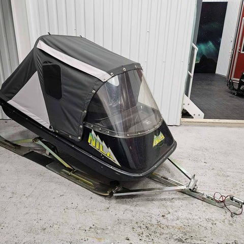 Fin skoterpulka med monterad dieselvärmare och avgasrör som mynnar ut bakom pulkan så man slipper avgaser från den.
