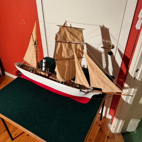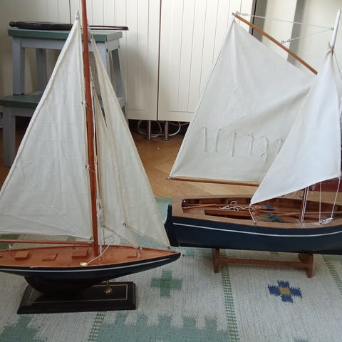 Set med tre modellbåtar bestående av två segelbåtar och en fiskebåt. Båtarna är huvudsakligen tillverkade i trä med detaljer i metall och plast samt segel i textil. Passar som inredningsdetaljer eller samlarobjekt. Storlekarna varierar mellan mindre och större modeller, se måttband på bild för ungefärlig längd.