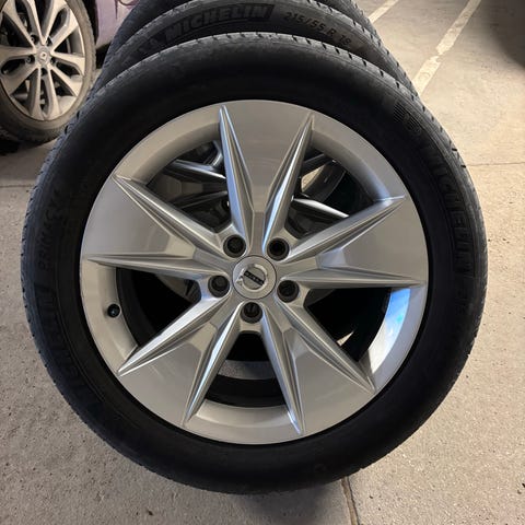 Fälgarna är i bra skick. Däcken har 5mm mönsterdjup på två däck och 4mm på dom andra två.