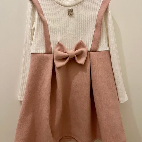 Klänning för flicka i storlek 128. Klänningen är brun med mönstrad framsida och baksida samt vita ärmar och vit krage. Lämplig för vardag eller mer uppklädda tillfällen beroende på hur den kombineras med andra plagg och accessoarer.