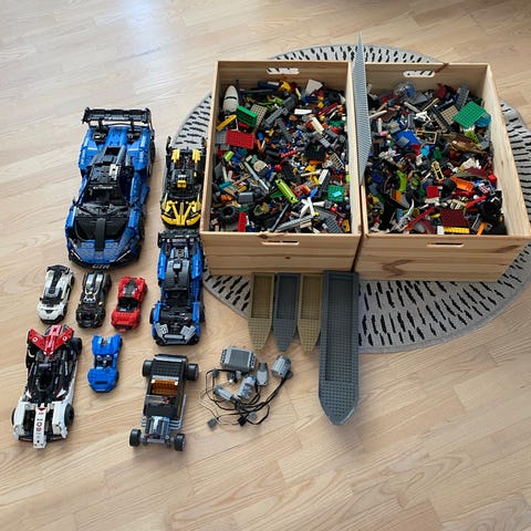 Lego City och Lego Technic blandade byggsatser med fokus på fordon och båtar. Det finns även en större Technic-bil med tillhörande byggbeskrivning och kartong. Flera originalmanualer till olika set ingår. Delarna är blandade i en låda och kan användas för att bygga upp de visade modellerna eller för egna konstruktioner. De flesta bitar samt figurer till instruktionerna borde finnas.