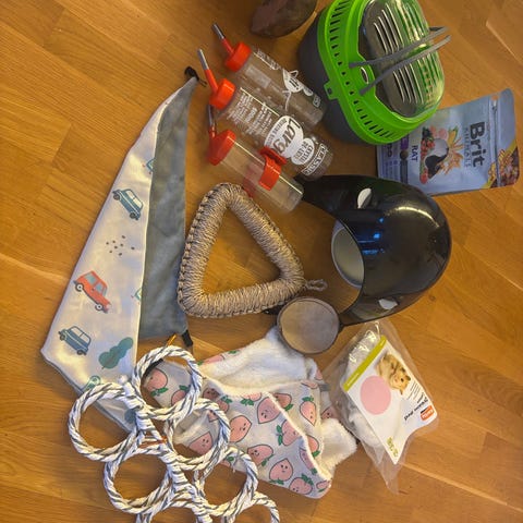 En oanvänd sele med koppel samt en foderhake för kanin eller marsvin.