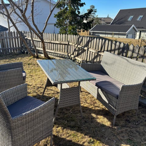 Rottingfåtöljer 6 st med dynor och Brafab soffbord ute grå rektangulärt