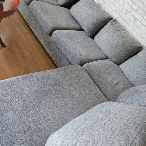 Grå hörnsoffa i tyg med modern och stilren design. Soffan är rymlig och bekväm med plats för flera personer. Använd men i fullt fungerande skick. Säljs i befintligt skick enligt bilderna