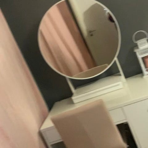 Sminkbord med oval spegel i vit färg. Bordet har två mindre lådor på bordsskivan för förvaring av smink eller accessoarer.