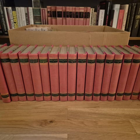 Carl Grimberg Svenska folkets underbara öden bokserie. Flera inbundna volymer i serien syns på bilderna, med hårda pärmar i rött och grått. Böckerna är på svenska och behandlar svensk historia i flera delar. Passar för den som vill ha ett samlat historiskt referensverk i bokhyllan.