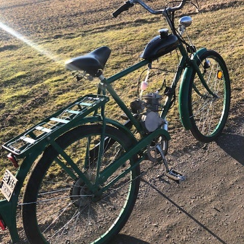 Mustang.50-talalare i klassisk modell med ram och skärmar i röd och vit färg.fina däck, Utrustad med bensintank, kedjedrift och trampor. Motorn.nerplockad