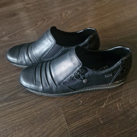 Rieker sneakers i storlek 40. Skorna är svarta med snörning och dragkedjedetalj på sidan. Yttersulan är mönstrad för bättre grepp. Passar som vardagsskor eller för lättare promenader.