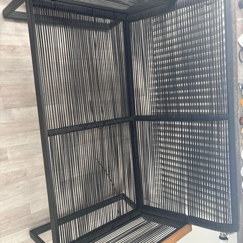 Trädgårdsbänk med ryggstöd i svart metallram och mörk nätväv. Bänken har två sittplatser och är avsedd för utomhusbruk, exempelvis på altan, balkong eller i trädgård. Sits och rygg består av genomsläpplig väv som torkar snabbt och ger ventilation vid användning. Passar som sittmöbel i utemiljöer där man vill ha en enkel och lättskött bänk.