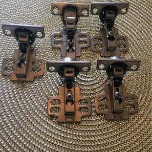 Metallgångjärn och beslag för skåpsdörrar. På bilden syns flera kompletta gångjärn med tillhörande monteringsplattor och skruvar, avsedda för montering på skåp eller köksluckor. Delarna är i metall och lämpar sig för inomhusbruk, exempelvis i kök, garderober eller andra förvaringsskåp där justerbara gångjärn behövs.