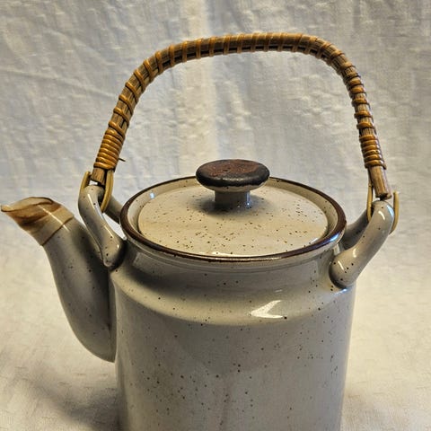 Rörstrand Keramik tekanna med matchande kanna i stapelbar modell. Design Gunnar Nylund. Setet består av en tekanna upptill och en kanna nedtill som kan användas för servering av till exempel te eller kaffe. Ytan är glaserad i brun ton med ljusare skiftningar. Hämtas i Tyresö av köparen