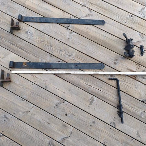 Blandat parti äldre beslag och metallstänger. På bilderna syns bland annat en bultliknande stång-stängningsbeslag två längre metallister med förborrade hål samt ett skjutregel-liknande beslag. Delarna är gjutjärn och uppvisar slitage och rost. Lämpligt som reservdelar eller för olika bygg- och reparationsprojekt där begagnat material kan användas. Mått framgår delvis av tumstocken på bilderna.