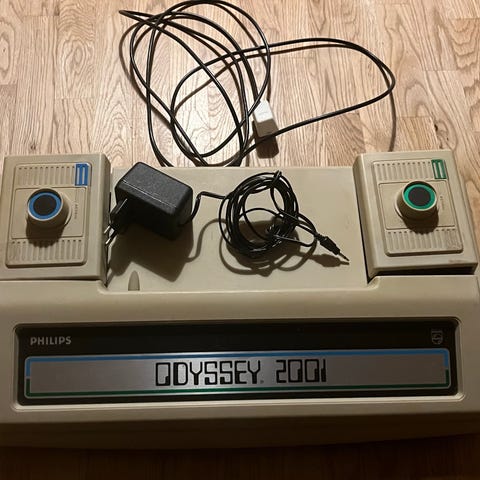 Spelkonsol vintage bordsmodell med inbyggda kontroller och anslutna handkontroller. Konsolen är avsedd för anslutning till TV och har knappar och reglage på ovansidan för styrning av spelet. Passar för den som söker en äldre spelkonsol av enklare typ för klassiskt TV-spelande.