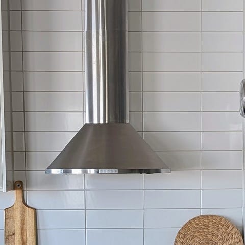 Miele väggmonterad köksfläkt i rostfritt stål. Fungerar utmärk, dock lite avskavd färg på knapparna. Fläkten är utrustad med frontpanel med knappar för olika fläkthastigheter och belysning över spishällen. Perfekt för lantstället!
