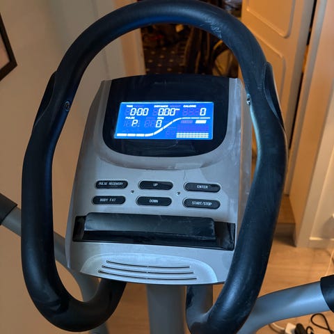 Crosstrainer i grå/silver färg. Utrustad med två höga handtag och fotplattor för stående träning. Passar för konditionsträning inomhus och kan användas av både kvinnor och män. Lämplig för hemmagym eller träningsrum.
