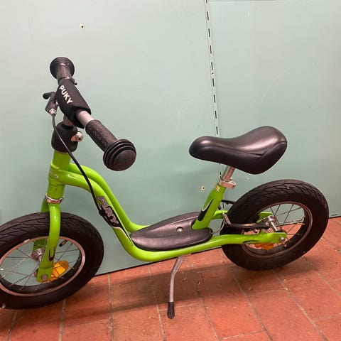 Puky barncykel med 12-tums hjul i grönt. Den låga ramen gör det enkelt för barn att ta sig på och av. Utrustad med kedjeskydd, pakethållare, stänkskärmar, bakre reflex samt hand- och fotbromsar.