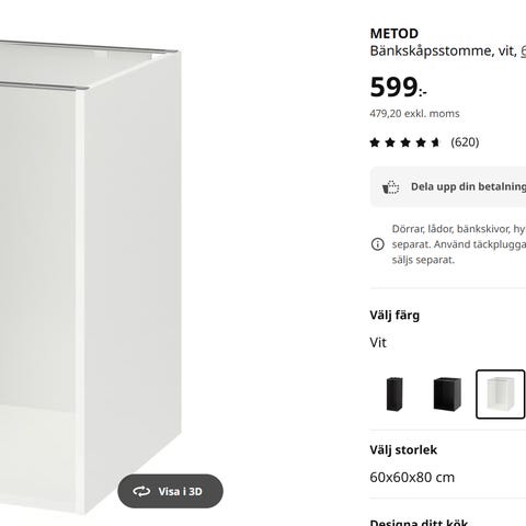 Metod bänkskåp 60 cm brett med Veddinge dörr i vitt. 500 kr