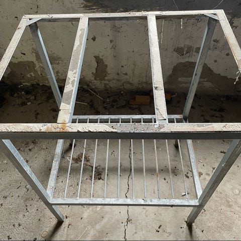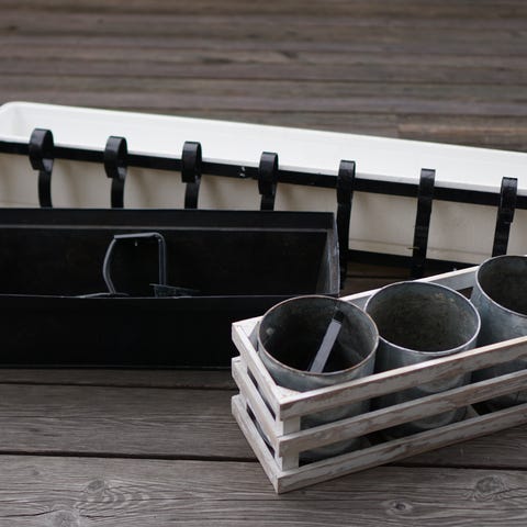 Blomlåda på ben i trä med innerlåda i metall. Rektangulär modell med dekorativa detaljer på sidorna och fyra ben. Lämplig för plantering av blommor eller växter inomhus, eller på altan, balkong eller i växthuset. Insidan visar spår av tidigare användning och slitage.