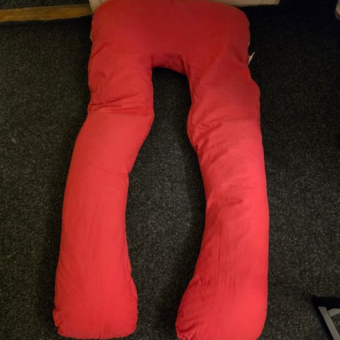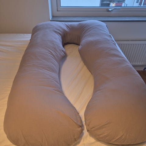 kroppskudde i vit färg. Lång, U-formad kudde som ger stöd längs hela kroppen. Kan användas som gravidkudde, amningskudde eller extra stöd vid sömn och vila. Avsedd för användning i säng eller soffa för ökat komfortstöd runt kropp, ben och rygg.