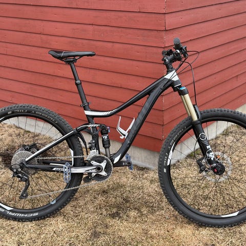 Giant heldämpad cykel med ramstorlek M och 27,5" hjul. Cykeln har fram- och bakdämpning anpassad för stig- och terrängkörning. Utrustad med grovmönstrade däck för bra grepp på varierande underlag samt hydrauliska skivbromsar för kontrollerad inbromsning. Passar för mountainbikeåkning och pendling på blandat underlag.